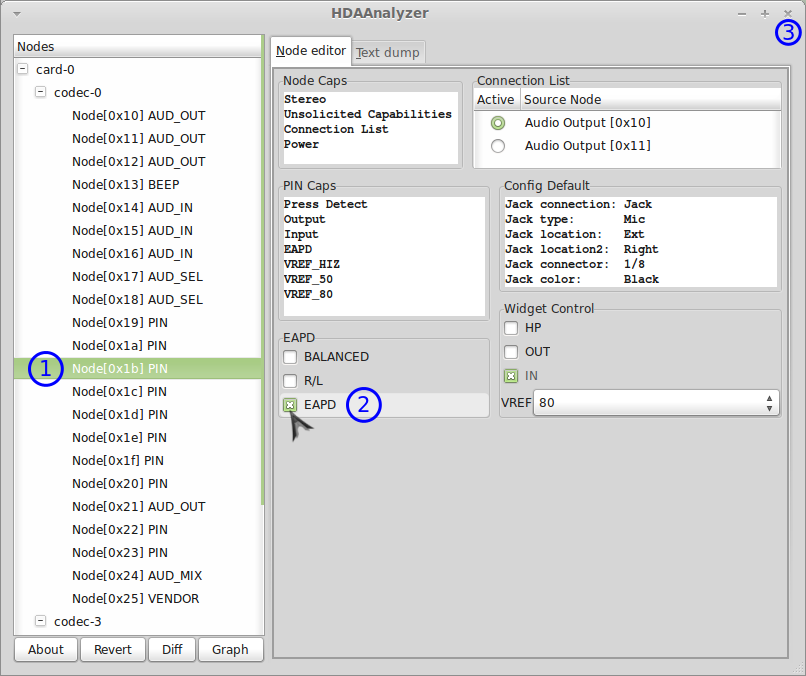You’ll get a nice GUI, in which you should first click “Node[0x1b] PIN“. Then, under EAPD, click the box next to EAPD. Go ahead and exit the application by clicking the “x” in the top right corner.